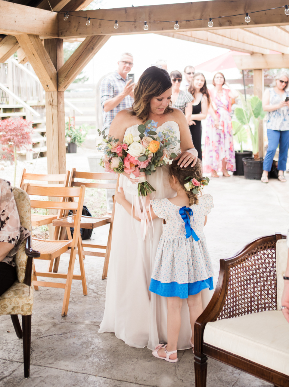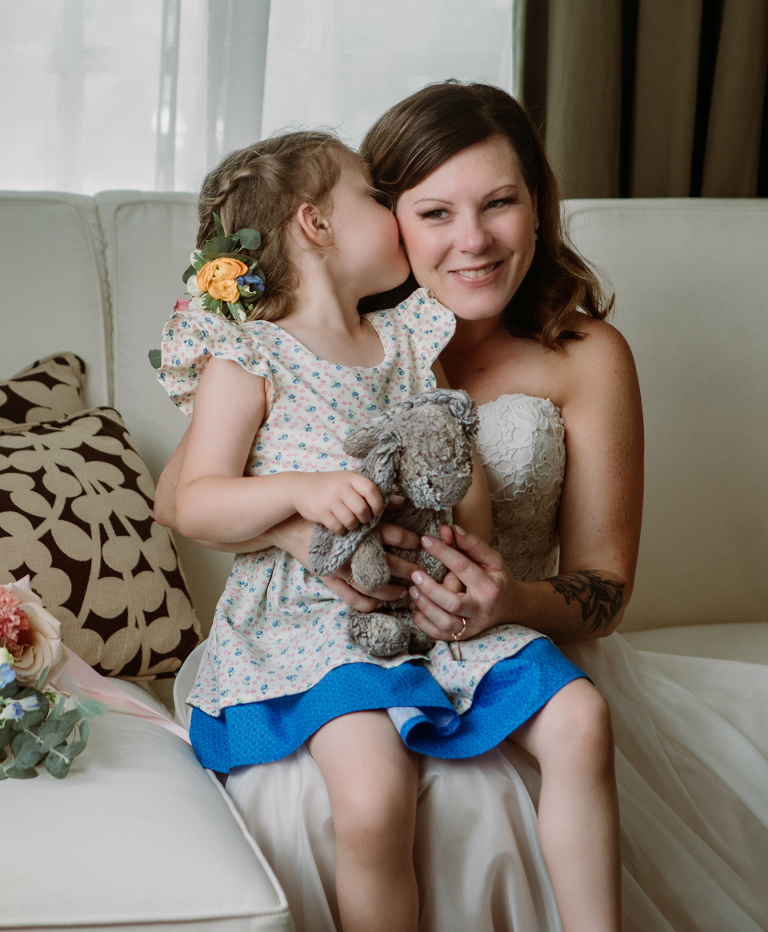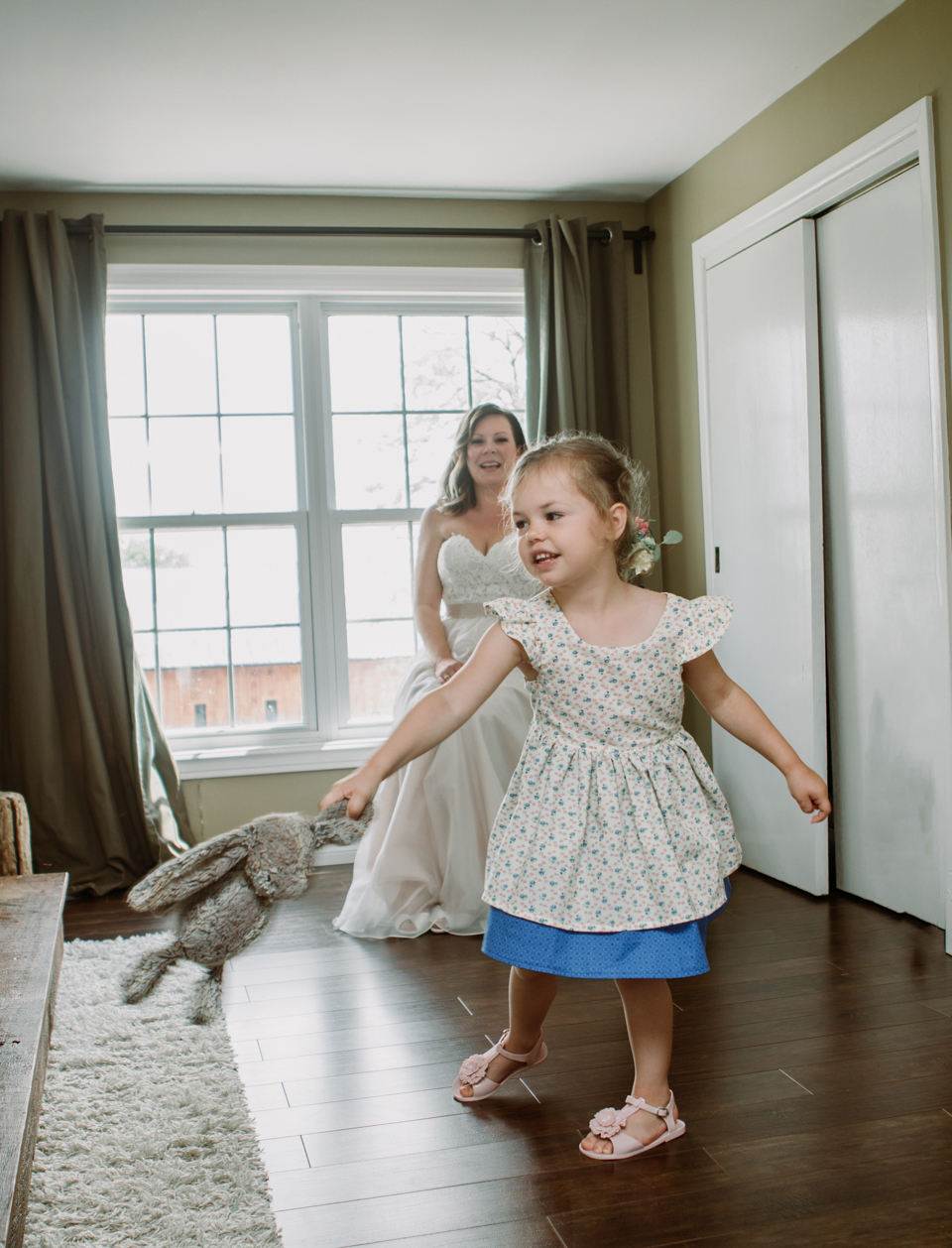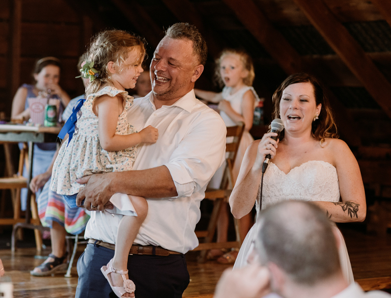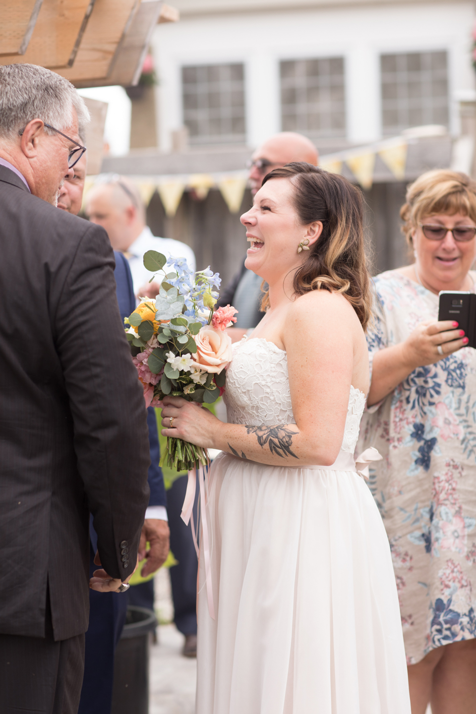 Their beautiful union was a small, intimate affair at 14th Coffee Company in Essex. The venue is beautiful, boasting a small cafe, a barn with a loft, an amazing house rental and gorgeous grounds and gardens. Nikki walked down the aisle in her beautiful blush gown and met Mark underneath a spray of amazing flowers. They wrote their own vows, which cause some tears, smiles and certainly some laughs. Even though their 3 year old daughter Georgia didn’t want to go down the aisle, there were some tender moments with her mom. Cocktails and appetizers were served in the garden before we headed up to the loft in the barn for dinner.