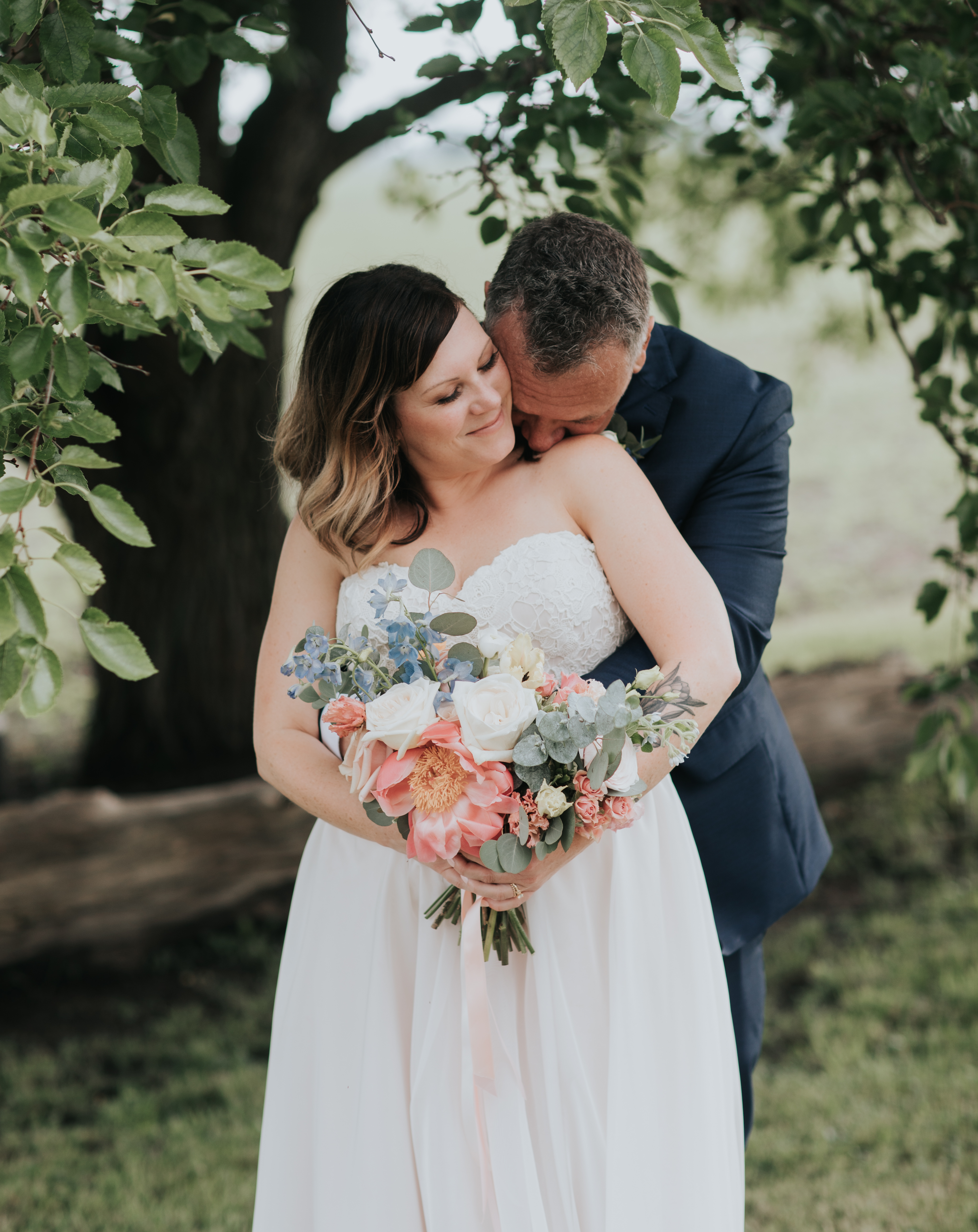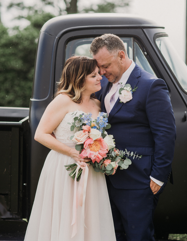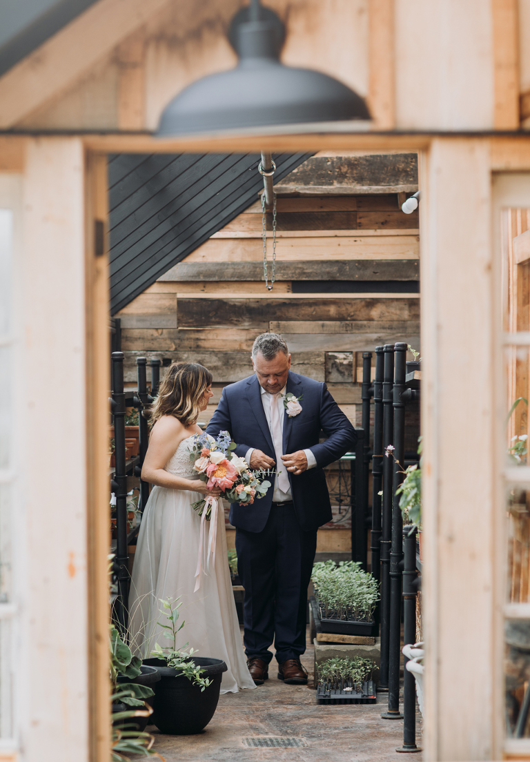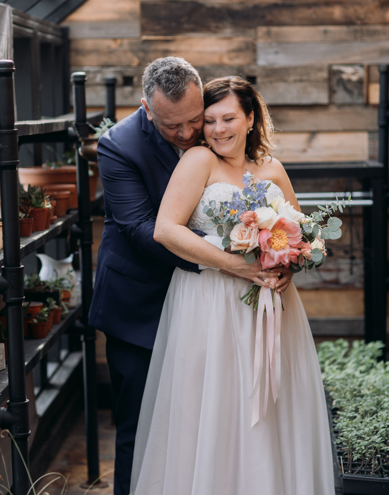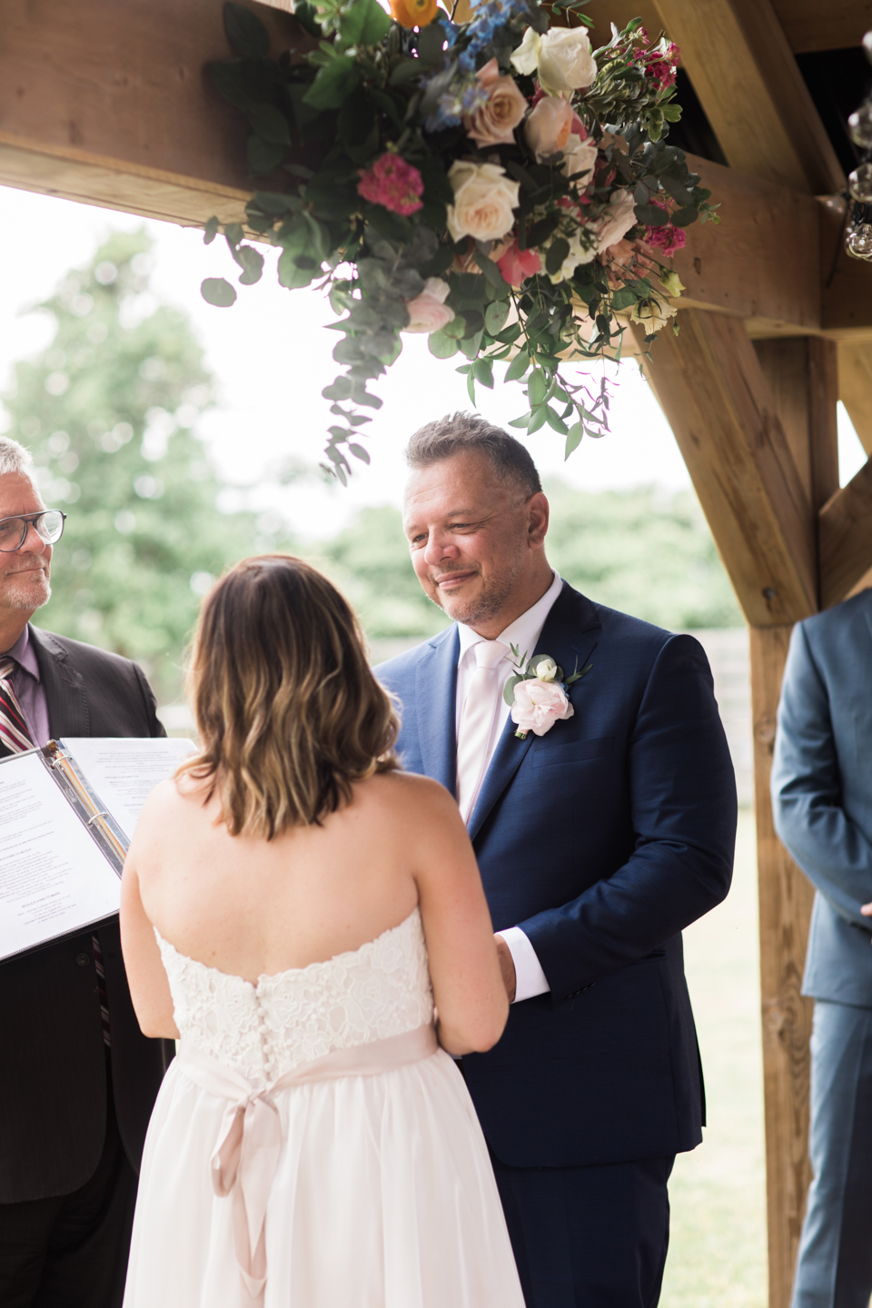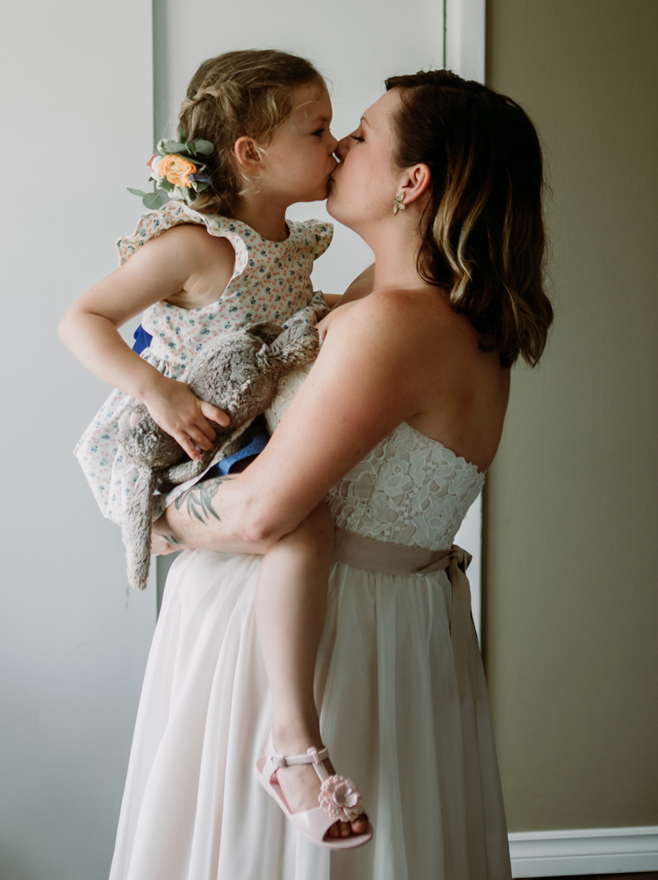 Their beautiful union was a small, intimate affair at 14th Coffee Company in Essex. The venue is beautiful, boasting a small cafe, a barn with a loft, an amazing house rental and gorgeous grounds and gardens. Nikki walked down the aisle in her beautiful blush gown and met Mark underneath a spray of amazing flowers. They wrote their own vows, which cause some tears, smiles and certainly some laughs. Even though their 3 year old daughter Georgia didn’t want to go down the aisle, there were some tender moments with her mom. Cocktails and appetizers were served in the garden before we headed up to the loft in the barn for dinner.
