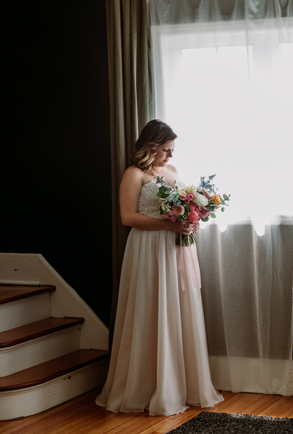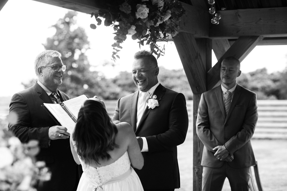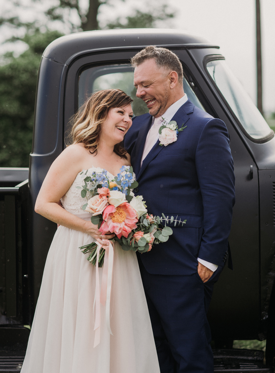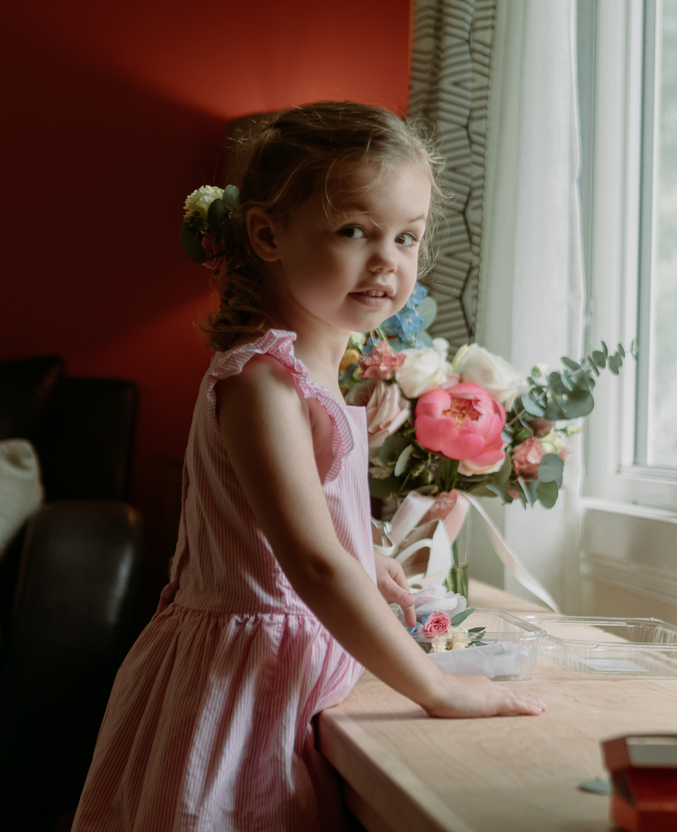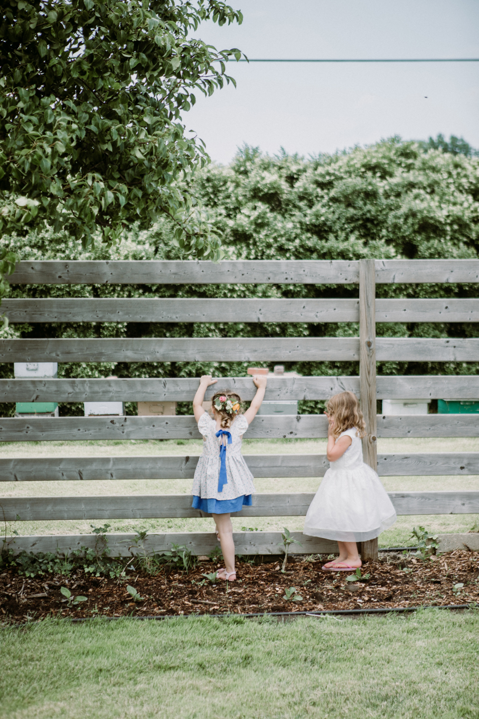 Their beautiful union was a small, intimate affair at 14th Coffee Company in Essex. The venue is beautiful, boasting a small cafe, a barn with a loft, an amazing house rental and gorgeous grounds and gardens. Nikki walked down the aisle in her beautiful blush gown and met Mark underneath a spray of amazing flowers. They wrote their own vows, which cause some tears, smiles and certainly some laughs. Even though their 3 year old daughter Georgia didn’t want to go down the aisle, there were some tender moments with her mom. Cocktails and appetizers were served in the garden before we headed up to the loft in the barn for dinner.