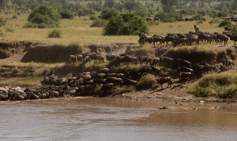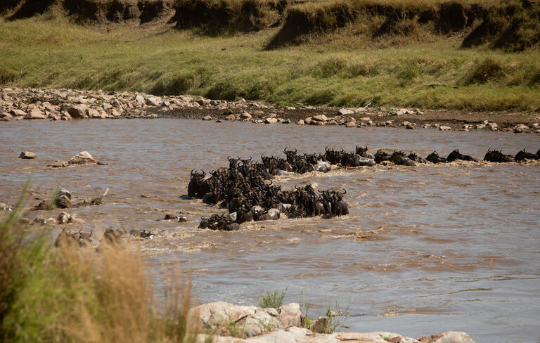 We. continued on our journey to the northern Serengeti, near the Mara River. This is the infamous river that you see the Wildebeest cross during the Great Migration in every National Geographic documentary. It is simply stunning. It is not as desolate as the central part. During the migration you know in your mind there will be a lot of animals……and then you get there and are blown away. In every direction you look, not hundreds, not thousands, but tens of thousands of Wildebeest occupy the landscape. It is an overwhelming sight, beautiful and wondrous. The large groups of animals wait at the banks of the river on the Kenyan side, contemplating if it the right time to cross or not. After all it is a dangerous undertaking. Crocodiles and hippos wait for this for their grandest meal all year. The group gather and wait, sometimes for minutes, hours, days or even weeks. So the timing to view the actual crossing of the river is pure luck. Luck was in our favour while we were there. We were blessed to see a large group of Wildebeest and zebras make the dangerous cross after only waiting for around 30 minutes to see if they dared. It was like watching that National Geopgraphic documentary in real life. I feel privileged to have witnessed it . I know have seen two of the 7 Natural Wonders of the World. Victoria Falls in Zimbabwe and now The Great Migration.