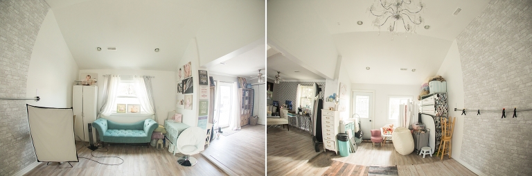 Back in 2011, my hubby and I went on a search for a house with something that could possibly work as a studio for me, as I was currently using my basement. We had looked at this house that had a old barn that had been transformed by the previous owner into a two car garage with an upstairs and an addition on the back. The small addition at that time was a man cave! We quickly turned it into a small, small studio for me to use. A year later we decided to expand the studio and doubled the size. It opened it up a bit, but it still wan’t sufficient for what I wanted to do and also for my quickly developing prop collection. So on to our third renovation for the studio, this time a much bigger one. We added onto the building a huge shooting area complete with a cathedral ceiling. It is a beautiful, airy space, designed in shade of grey and tiffany blue. Chandeliers are a common theme throughout the studio and it is styled in what I call vintage glam! We still have some work to do. This summer will be opening up the new entrance to the studio and providing a small outdoor area for clients to relax or play with their kids if they need a small break from a shoot! This studio has really been a labour of love. I want to thank my husband RJ, who made my dream a reality. He always makes my visions come alive. Thanks babe!!! So take a look and see what we have done!