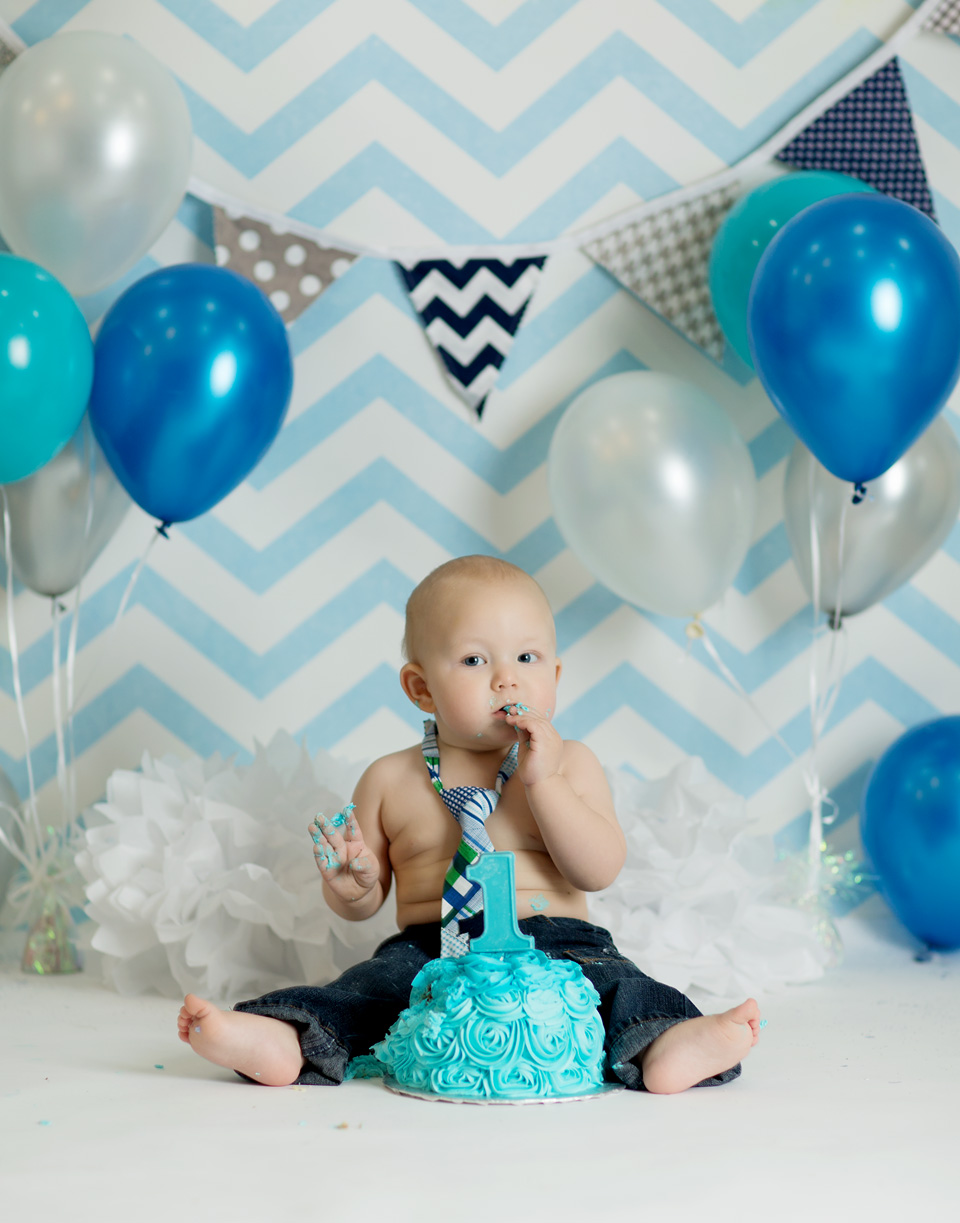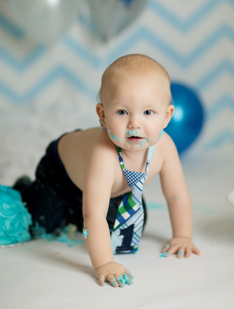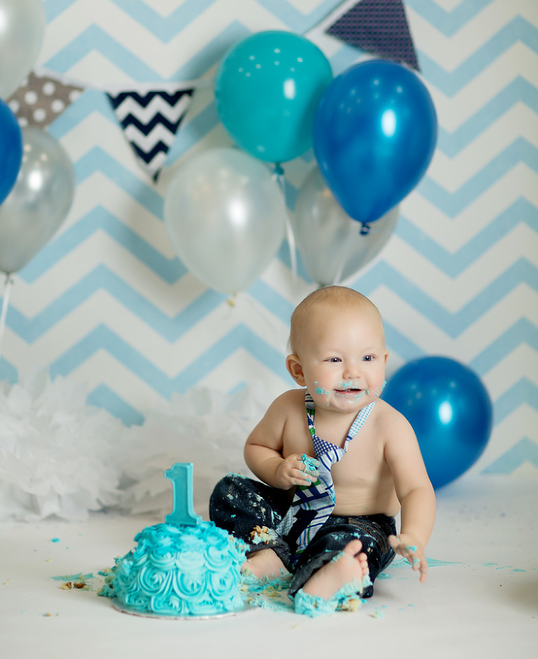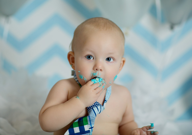 We love Cake Smash Sessions!  We love them for a lot of reasons.  The number one reason of course is watching the pure delight as these little ones devour their cake for the very first time.  We also love Cake Smash session because we also love seeing Mom and Dad’s reactions, not to mention the studio smells fantastic after a good cake smash. You never know how a cake smash session is going to go…some kids love it….some kids despise it….its alway a surprise.  Brady came to see us at Real Image Photography, for his Cake Smash Session. Based on a blue chevron theme, he was decked out in an adorable tie and immediately went to work on his cake!  He was pretty darn serious about his Cake Smash Session. He smashed about half of his cake and left a little for mom to take home to dad for a treat!