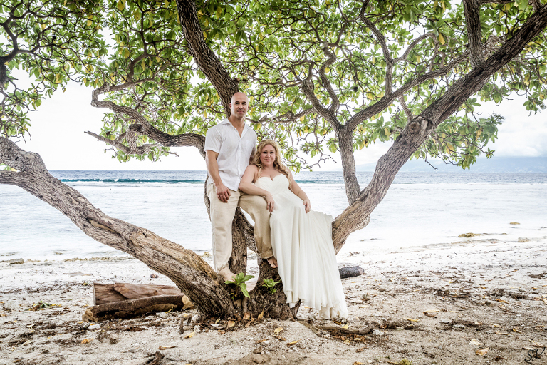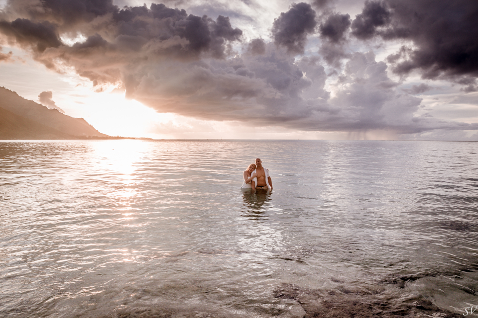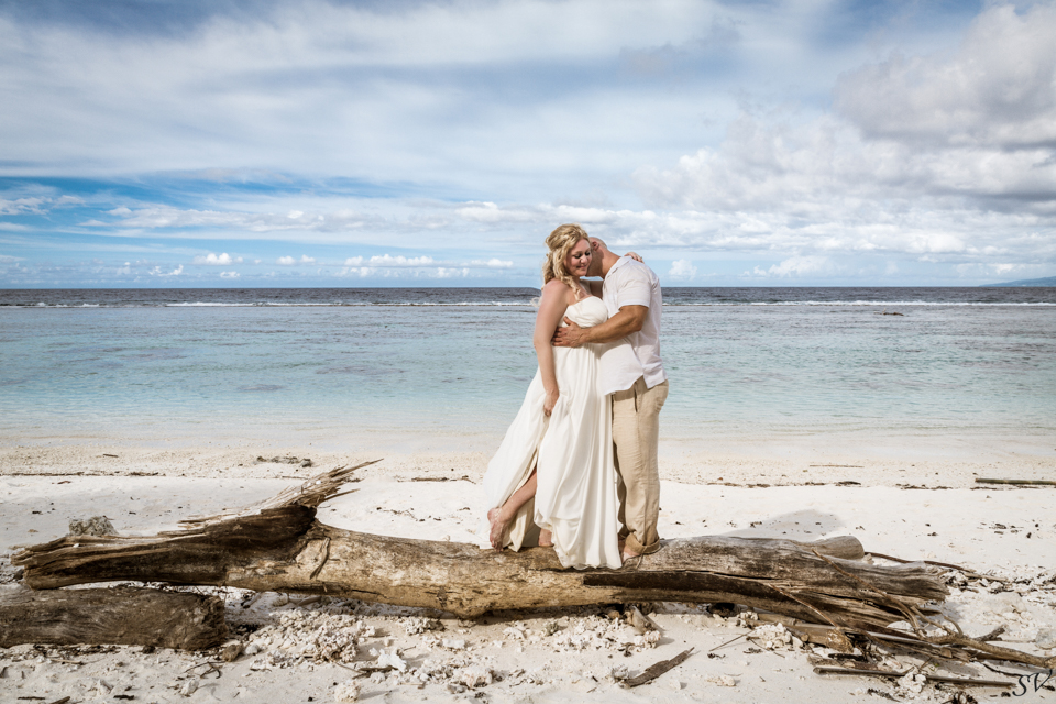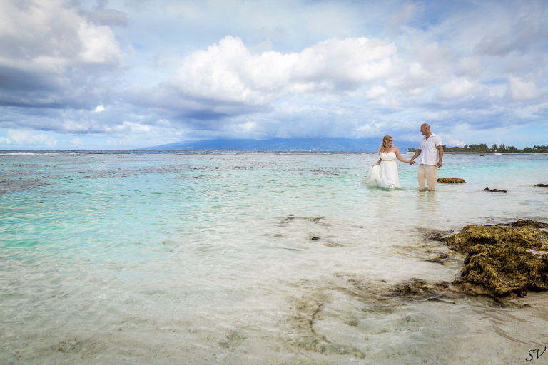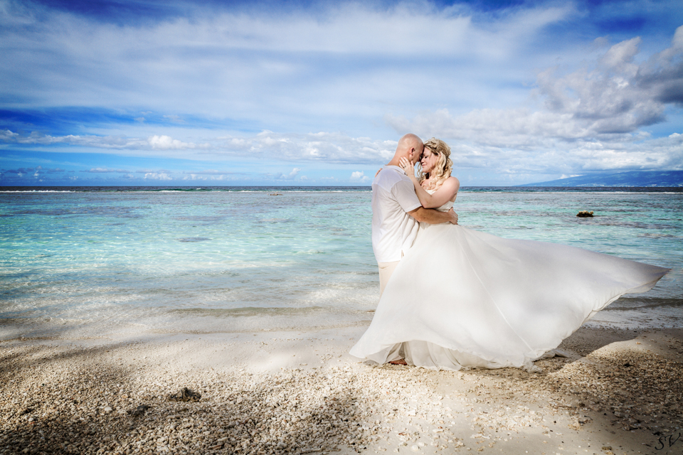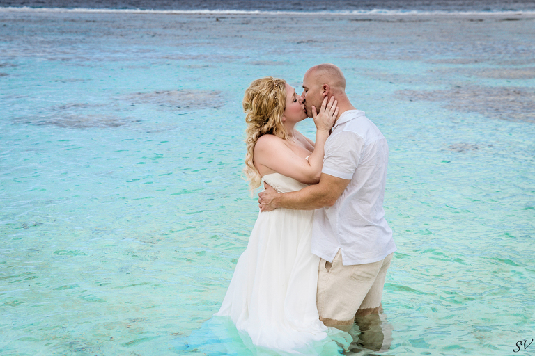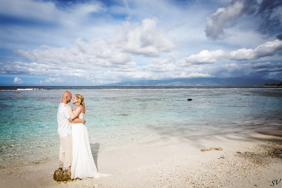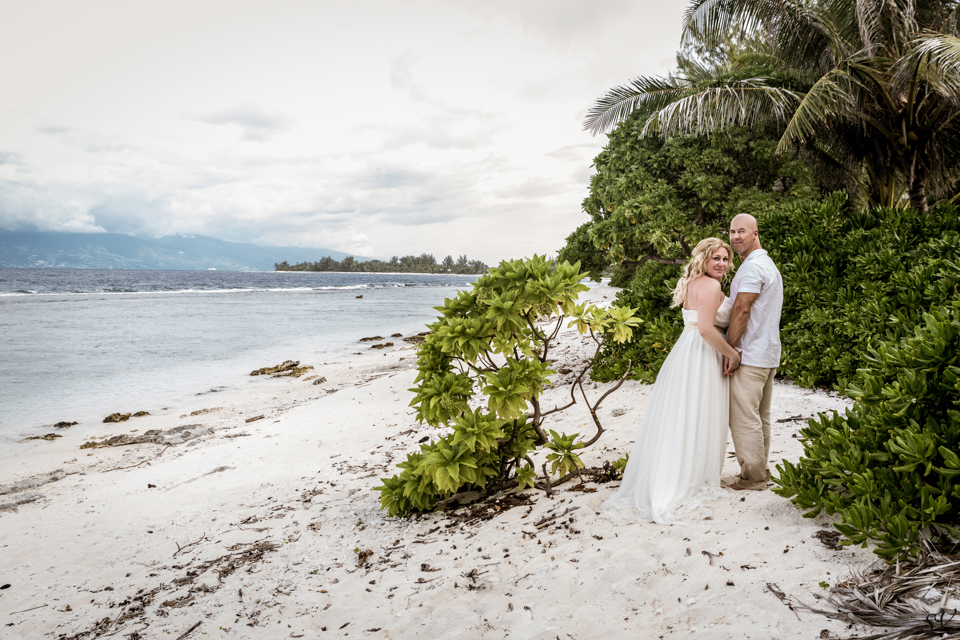 About 6 weeks before the trip I started to think “what if we renewed our vows in Moorea”….could it be possible? Would RJ go for it? How do we go about doing something like that? So I started to think about our wedding 12 years prior and how I would do it at his moment in time again. Like if I had to decide how to get married again right now on the spot what would I want to do. This was my answer: on a beach just me and him, being photographed, and not giving a damn about the dress, the guests, the cake or anything. At our wedding we had written our own vows and to his day, I hold them very very close to my heart. I started looking into officiants to do a ceremony for us and everything I came across was very “cookie cutter”, although I did find a Tahitian priest willing to do a traditional Tahitian ceremony, but that still didn’t sit right. Why did i need someone else to tell me what to say to my husband? So I decided we didn’t need that …all we needed was each other in a beautiful place, to make our promises to each other again. Oh yeah and a photographer to capture it all!!! So I found a husband and wife team SV Photography in Moorea and hired them to capture this for us. Here’s the thing….I didn’t tell my husband about any of this………till we got to Tahiti. lol He was thrilled and excited!