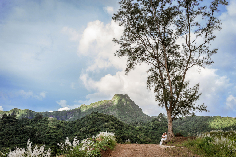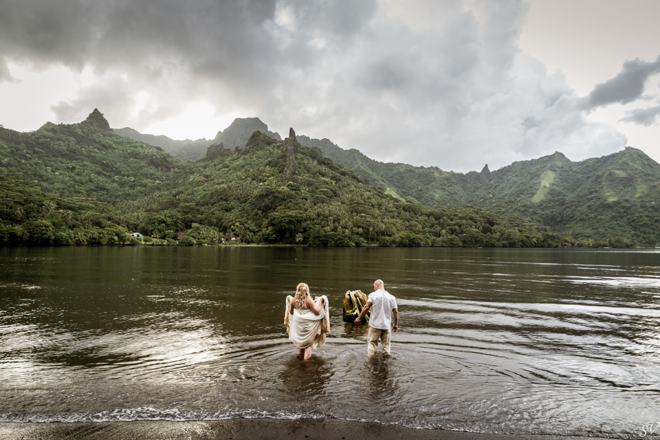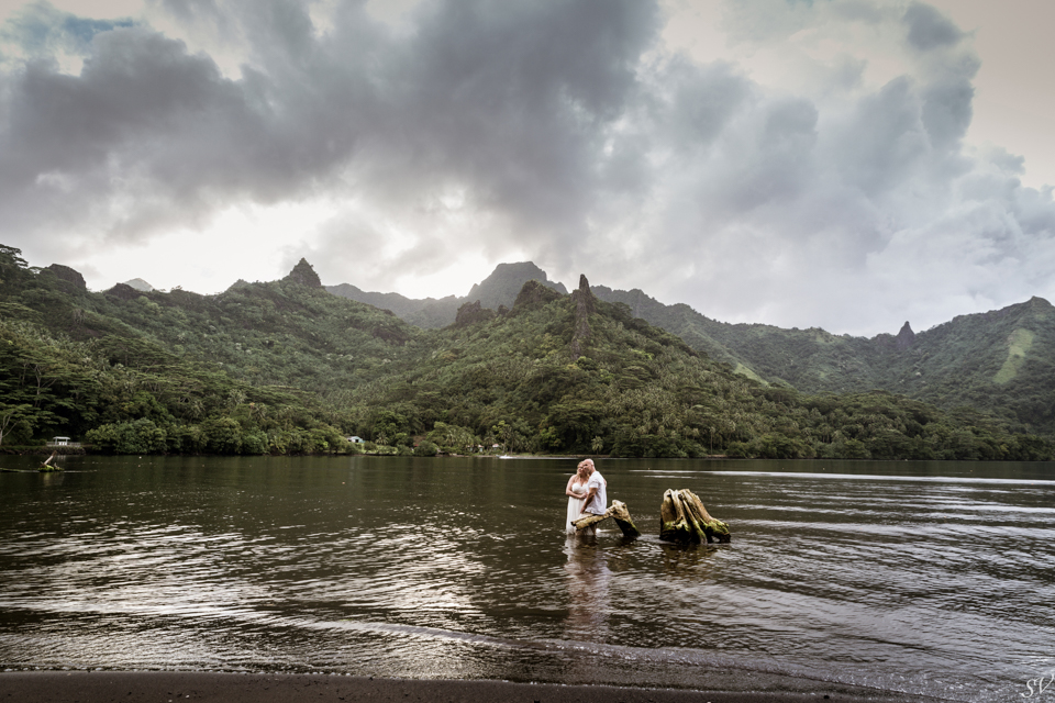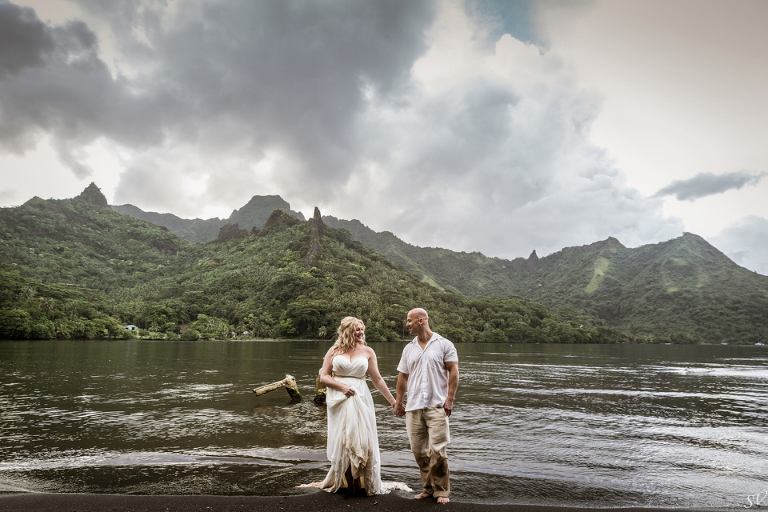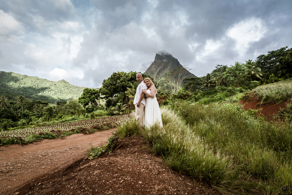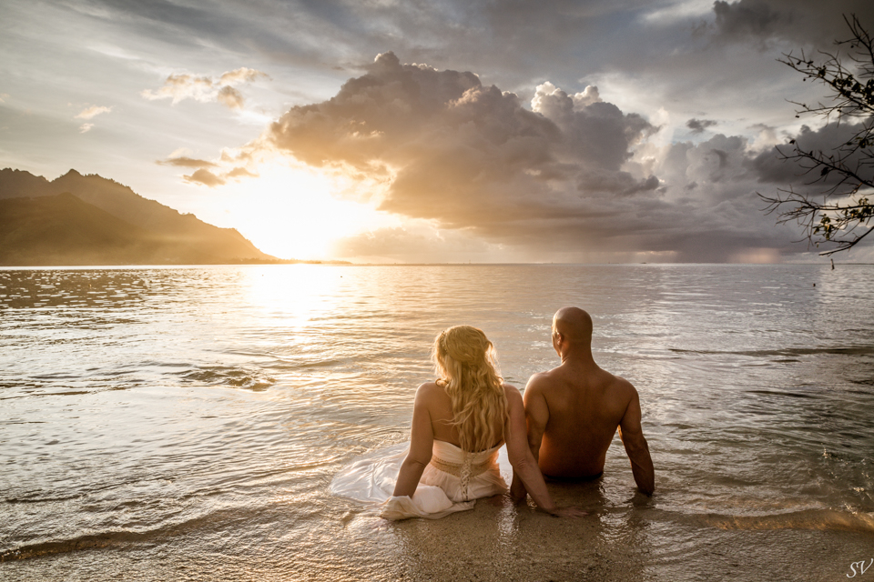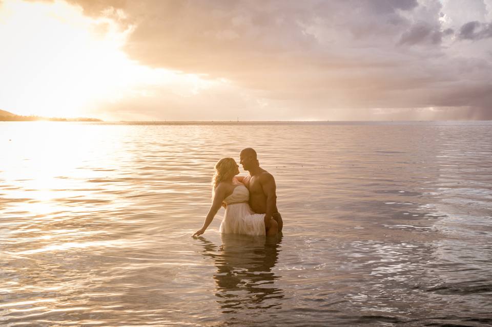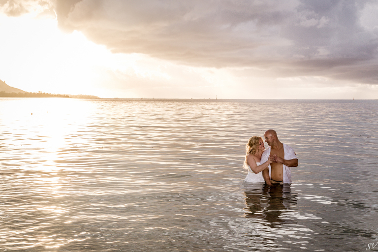 About 6 weeks before the trip I started to think “what if we renewed our vows in Moorea”….could it be possible? Would RJ go for it? How do we go about doing something like that? So I started to think about our wedding 12 years prior and how I would do it at his moment in time again. Like if I had to decide how to get married again right now on the spot what would I want to do. This was my answer: on a beach just me and him, being photographed, and not giving a damn about the dress, the guests, the cake or anything. At our wedding we had written our own vows and to his day, I hold them very very close to my heart. I started looking into officiants to do a ceremony for us and everything I came across was very “cookie cutter”, although I did find a Tahitian priest willing to do a traditional Tahitian ceremony, but that still didn’t sit right. Why did i need someone else to tell me what to say to my husband? So I decided we didn’t need that …all we needed was each other in a beautiful place, to make our promises to each other again. Oh yeah and a photographer to capture it all!!! So I found a husband and wife team SV Photography in Moorea and hired them to capture this for us. Here’s the thing….I didn’t tell my husband about any of this………till we got to Tahiti. lol He was thrilled and excited!